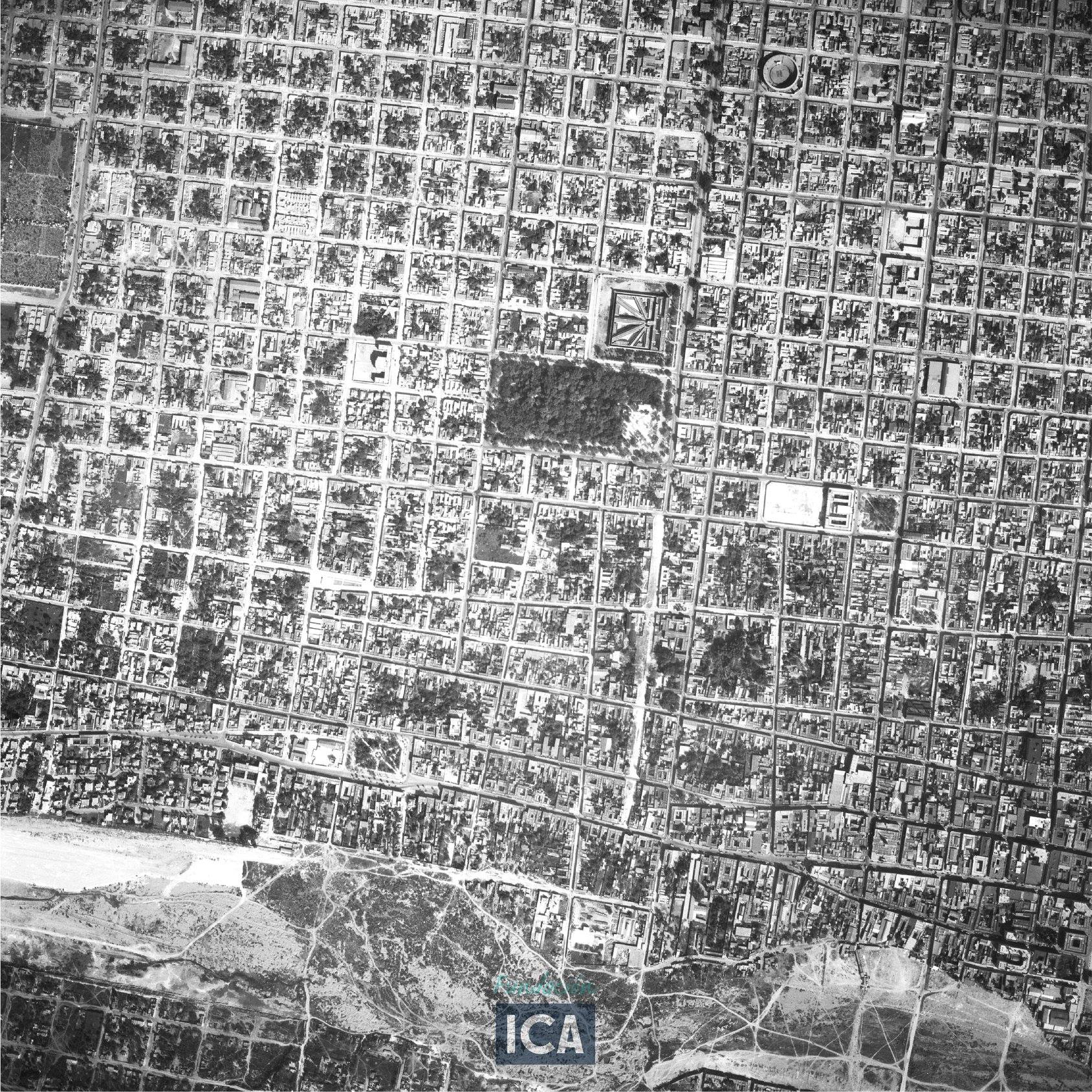 Fotografía aérea producida por la Compañía Mexicana Aerofoto, parte del acervo de la Fundación ICA. Se puede ver la Penitenciaría Monterrey a un costado de la Alameda, que fue demolida en 1943.